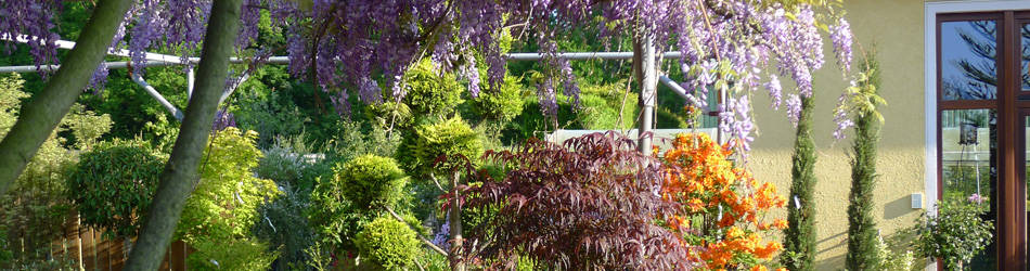 Ein Garten ist mehr als die Summe seiner Teile. Terrassen, Wege, Pavillions und Pflanzen bilden eine gestalterische Einheit. Mit Säulen- und Hängeformen, bizarren Schönheiten, Blütenträumen und Immergrünen aus unserer eigenen Baumschule setzen wir Akzente. Und wir lassen Sie auch bei der Pflege nicht im Regen stehen.